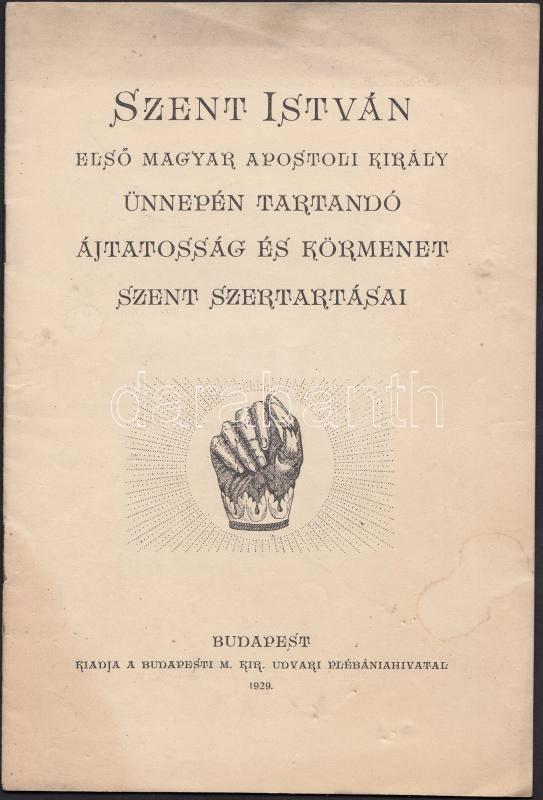 1929 Bp., Szent IStván első magyar apostoli király ünnepén tartandó áj... https://www.darabanth.com/de/201-Fernauktion/201.0/Andere-Sammelgebiete/Drucksachen~200011/1929-Bp-Szent-IStvan-elso-magyar-apostoli-kiraly-unnepen-tartando-ajtatossag-es-kormenet~II795178