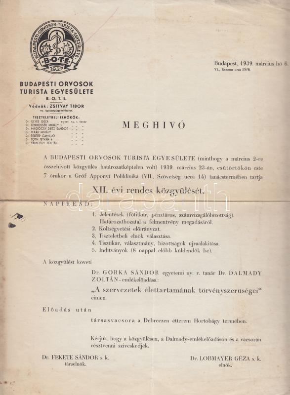Beschreibung: 1939 Bp., A Budapesti Orvosok Turista Egyesületének fejléces meghívója évi rendes közgyűlésre a napirendi pontok feltüntetésével
