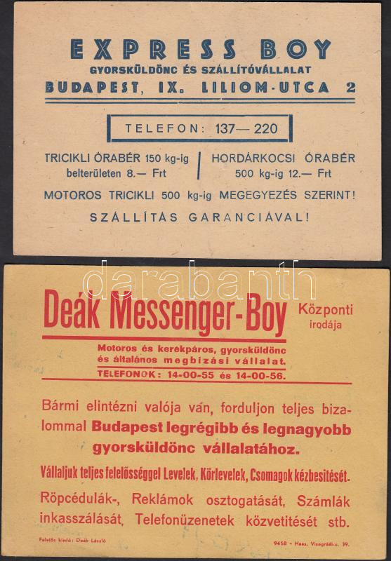 1942-1948 Bp., Express-Boy és Deák Messenger-Boy levelezőlapja https://www.darabanth.com/de/201-Fernauktion/201.0/Andere-Sammelgebiete/Drucksachen~200011/1942-1948-Bp-Express-Boy-es-Deak-Messenger-Boy-levelezolapja~II795115