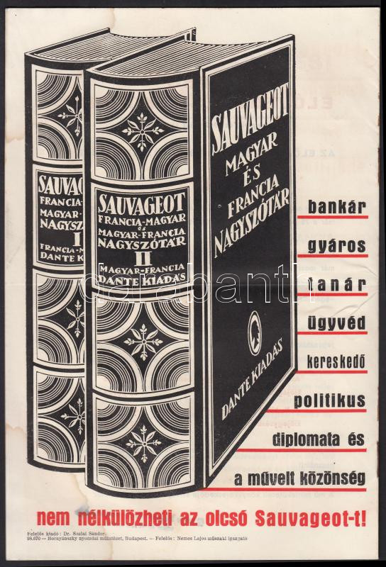 1942 Sauvageot, Magyar-francia és francia-magyar nagyszótár új kiadásá... https://www.darabanth.com/de/201-Fernauktion/201.0/Andere-Sammelgebiete/Drucksachen~200011/1942-Sauvageot-Magyar-francia-es-francia-magyar-nagyszotar-uj-kiadasanak-reklamismertetoje-~II796871
