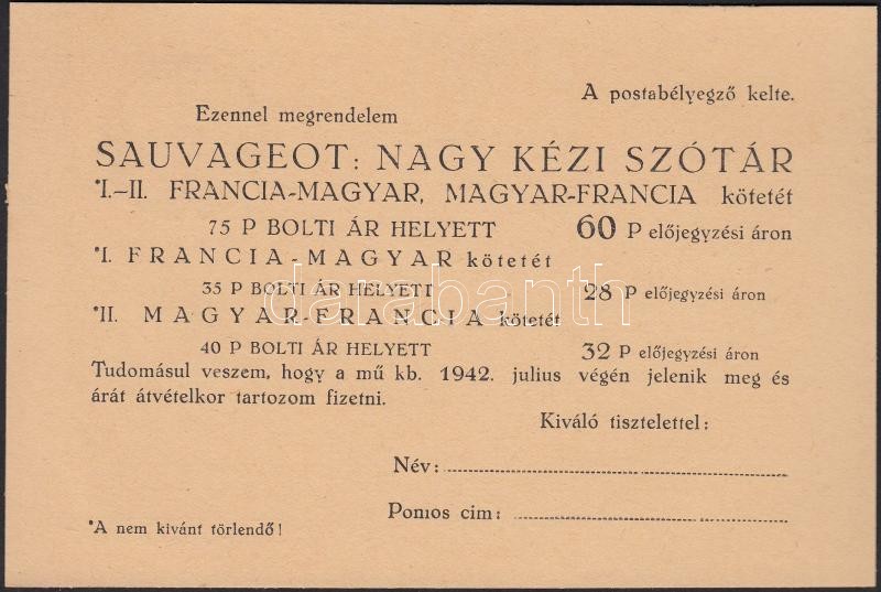 Beschreibung: 1942 Sauvageot, Magyar-francia és francia-magyar nagyszótár új kiadásának reklámismertetője és megrendelőlapja