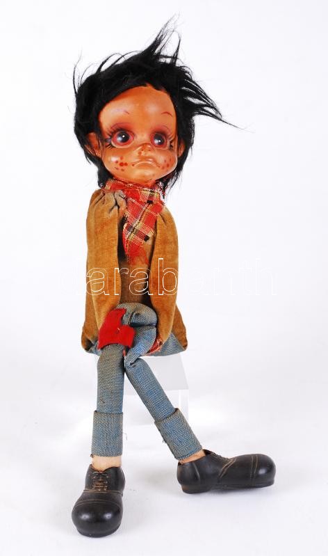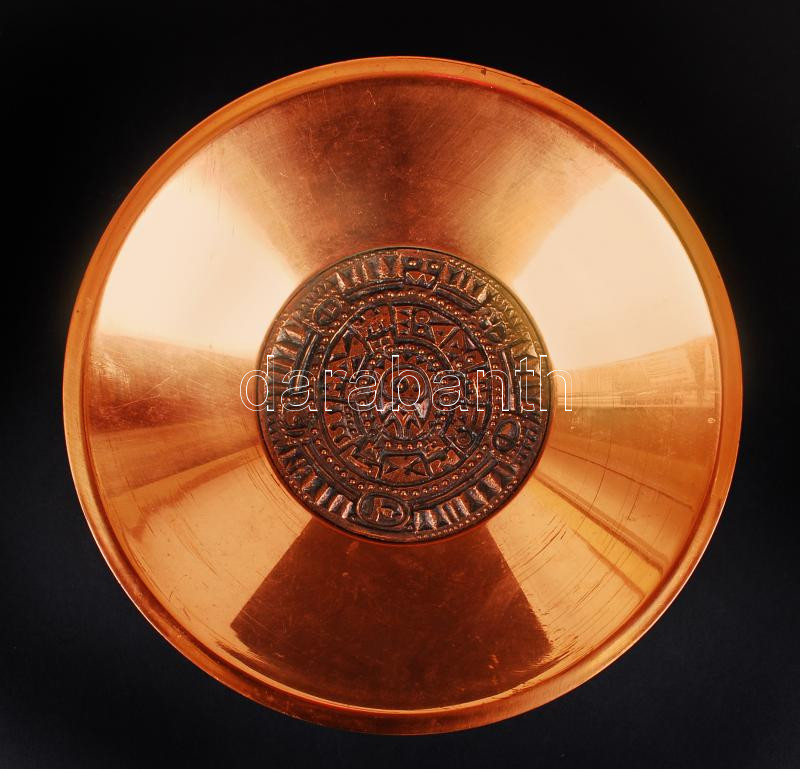 Vegyes tétel: Magyarcsák Mária (ötvös): Réz fali dísztál, jelzett, kopott, d:24 cm, Cca 1940 Játékbaba, h:25 cm,