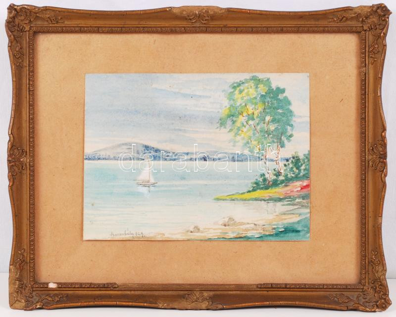 Beschreibung: Bokor Béla: Balaton part. Akvarell, papír, jelezett, üvegezett sérült keret 23×28 cm