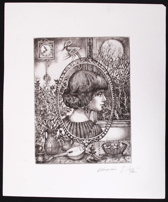Beschreibung: Kolozsvári G. Miklós (1950-): Lány a tükörben. Rézkarc, papír, jelzett, 19×14 cm