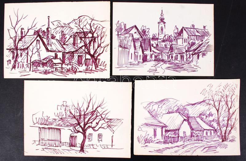 Beschreibung: Réti Mátyás (1922-2002): Falusi utcák. Filc, papír, jelzés nélkül, 15×21 cm, összesen: 4db