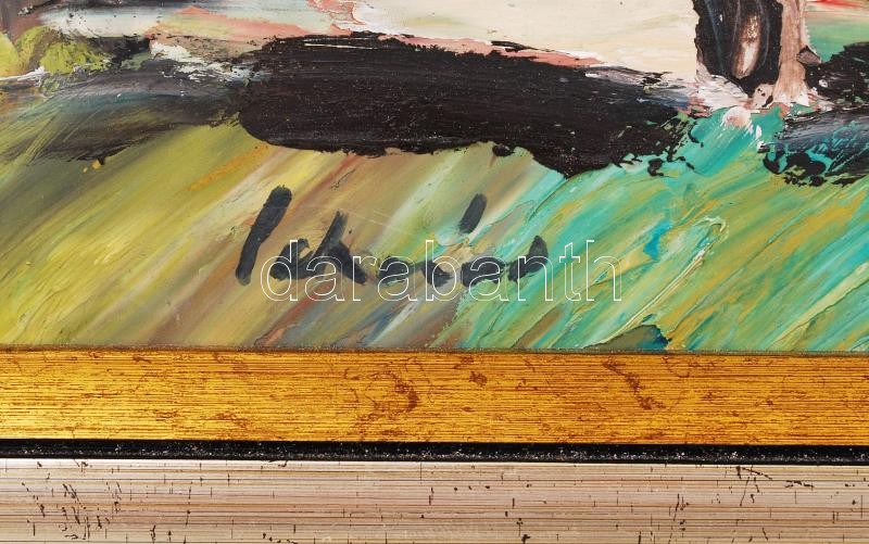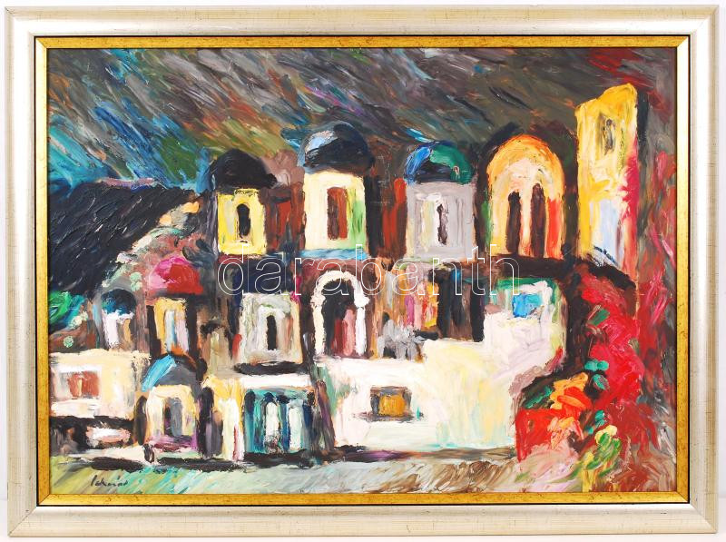 Beschreibung: Schéner Mihály (1923-2009): Házak. Olaj, farost, keretben, 50×70 cm