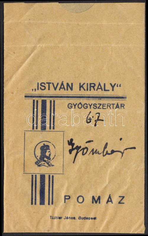 Pomáz, István király gyógyszertár recept boríték https://www.darabanth.com/de/201-Fernauktion/201.0/Andere-Sammelgebiete/Werbungen~200034/Pomaz-Istvan-kiraly-gyogyszertar-recept-boritek~II798189