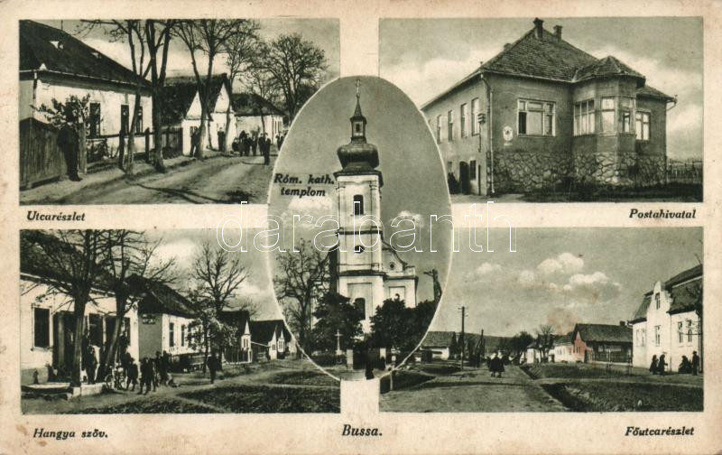 Bussa, Hangya, Main street, Roman catholic church, Post palace (fl) https://www.darabanth.com/de/201-Fernauktion/201.0/Ansichtskarten/Slowakei~900008/Bussa-Hangya-Main-street-Roman-catholic-church-Post-palace-fl~II796545