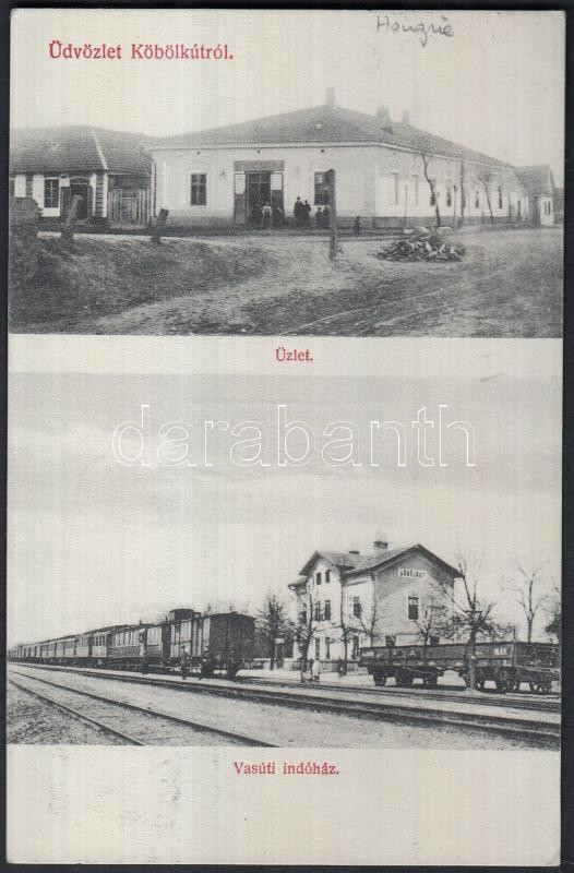 Beschreibung: Köbölkút Wiesenberg Dávid kereskedése, vasúti indóház; Wiesenberg Dávid kiadása / shop, railway station