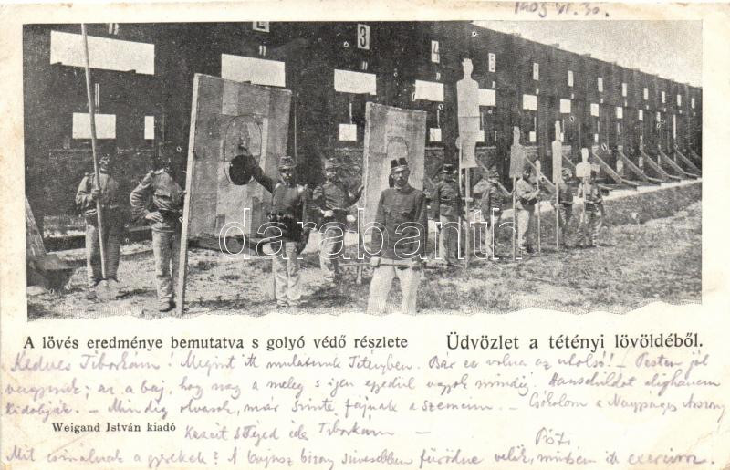 Beschreibung: Budapest XXII. Budatétény, Lövölde: a lövés eredménye bemutatva s golyó védő részlete;Weigand István kiadó (levágott / cut)