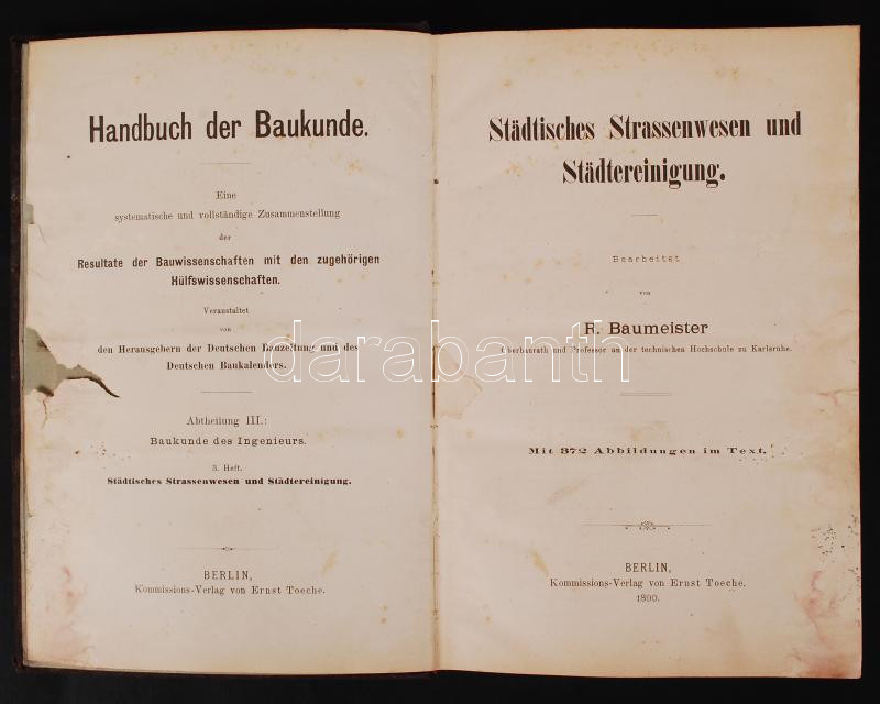 R. Baumeister: Städisches Strassenwesen mit 372 Abbildungen im Text. Berlin 1890 Erns Toeche. Részben foltos, egészvászon kötésben / partly stained in linen binding