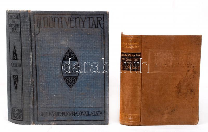 2 db könyv-Grecsák Károly (szerk.): Uj döntvénytár. A Magy. Kir. Curia ítélőtáblák, nemkülönben más legfelsőbb foku ítélőhatóságok elvi jelentőségű határozatai. VIII. kötet. Büntető törvény, sajtótörvény. Bp., 1912, Grill Károly Könyvkiadóvállalata. Kiadói egészvászon kötés, kopottas állapotban; Magyar magánjog mai érvényben, III. kötet, kötelmi jog. Bp., 1928, Grill Károly. Kiadói egészvászon kötésben, kopottas állapotban.