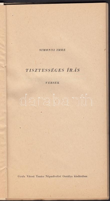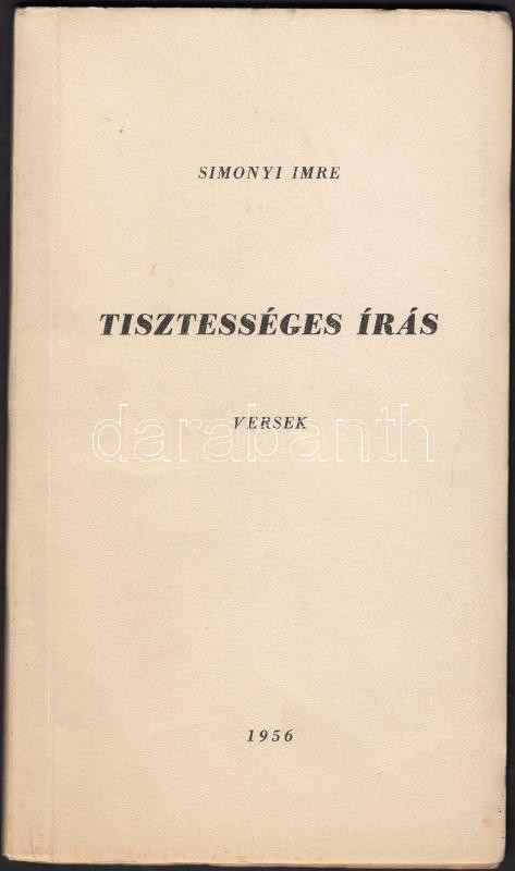 Simonyi Imre: Tisztességes írás. Versek. 1956. Gyula, 1956, Gyula Váro... https://www.darabanth.com/de/202-Fernauktion/202.0/Andere-Sammelgebiete/Bucher-Sonstige-Raritaten~200036/Simonyi-Imre-Tisztesseges-iras-Versek-1956-Gyula-1956-Gyula-Varosi-Tanacs-Nepmuvelesi-~II802625