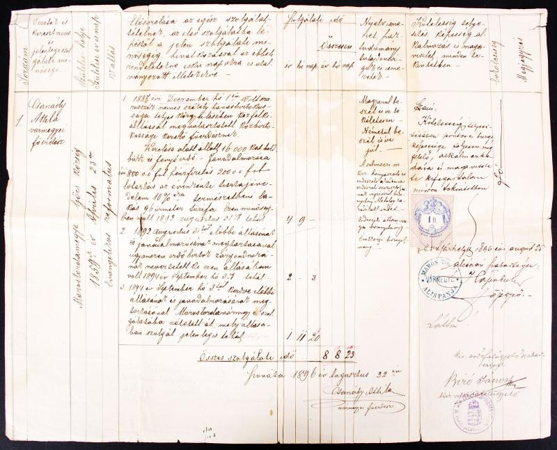 Beschreibung: 1896 Csanády Attila Maros vármegyei főerdész szolgálati minősítő lapja munkájának szóbeli értékelésével