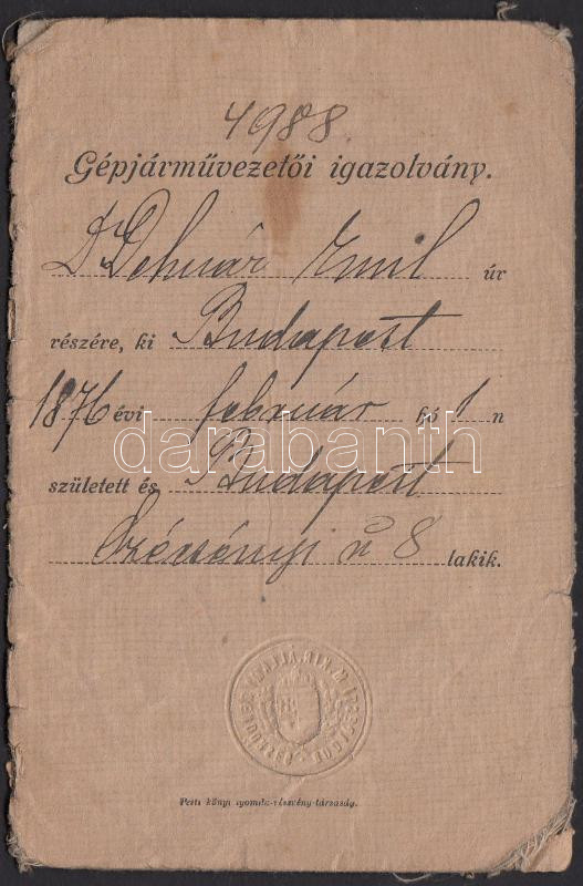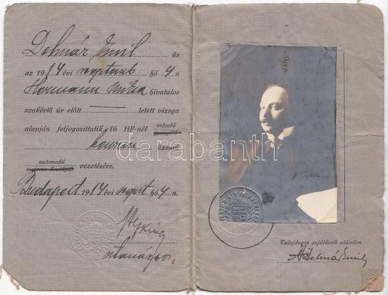 1914 Bp., A Magyar Királyi Állami Rendőrség által kiállított fényképes... https://www.darabanth.com/de/202-Fernauktion/202.0/Andere-Sammelgebiete/Dokument~200028/1914-Bp-A-Magyar-Kiralyi-Allami-Rendorseg-altal-kiallitott-fenykepes-gepjarmuvezetoi-~II802287