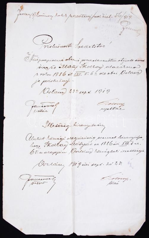 1919 szeptember 22. Oszlányon kiállított kétnyelvű illetőségi bizonyít... https://www.darabanth.com/de/202-Fernauktion/202.0/Andere-Sammelgebiete/Dokument~200028/1919-szeptember-22-Oszlanyon-kiallitott-ketnyelvu-illetosegi-bizonyitvany~II651026