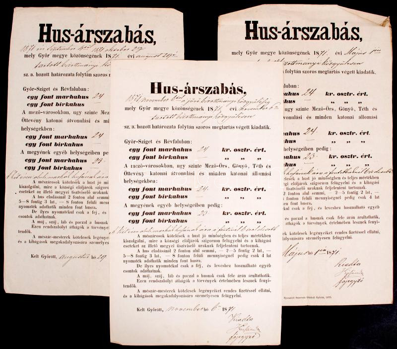 1871 Győr, Hús árszabási táblázat Győr vármegyére vonatkozóan, 3 db https://www.darabanth.com/de/202-Fernauktion/202.0/Andere-Sammelgebiete/Drucksachen~200007/1871-Gyor-Hus-arszabasi-tablazat-Gyor-varmegyere-vonatkozoan-3-db~II804628