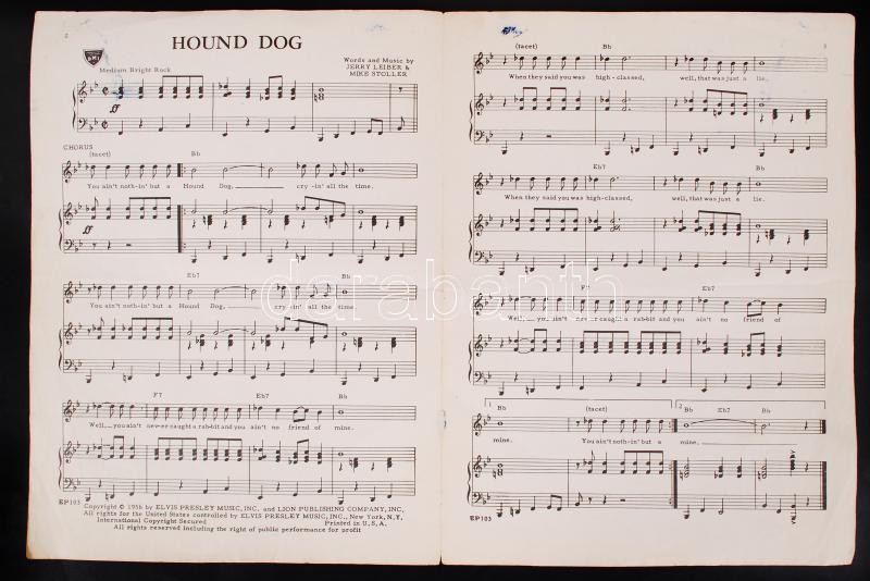 cca 1920 Elvis Presley: Hound Dog kotta és szövegkönyv / Lyrics and te... https://www.darabanth.com/de/202-Fernauktion/202.0/Andere-Sammelgebiete/Drucksachen~200007/cca-1920-Elvis-Presley-Hound-Dog-kotta-es-szovegkonyv-Lyrics-and-text-book~II801416