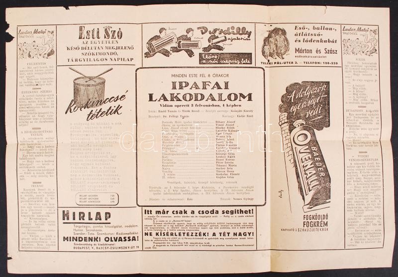 cca 1950 Fővárosi Operettszínház Ipafai lakodalom műsorfüzet https://www.darabanth.com/de/202-Fernauktion/202.0/Andere-Sammelgebiete/Drucksachen~200007/cca-1950-Fovarosi-Operettszinhaz-Ipafai-lakodalom-musorfuzet~II803968