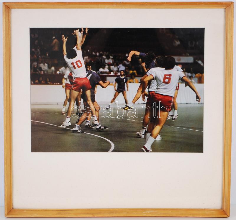 Beschreibung: Cca 1986 kézilabda mérkőzésről készült nagyméretű fotó, üvegezett keretben 53×50 cm/ 1986 Handball match