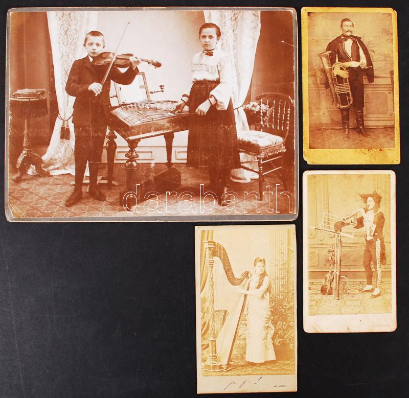 Beschreibung: cca 1880-1900 Régi, keményhátú fényképek hangszeres modellekről, 4 db fotó, 11x6 és 13x18 cm közötti méretekben