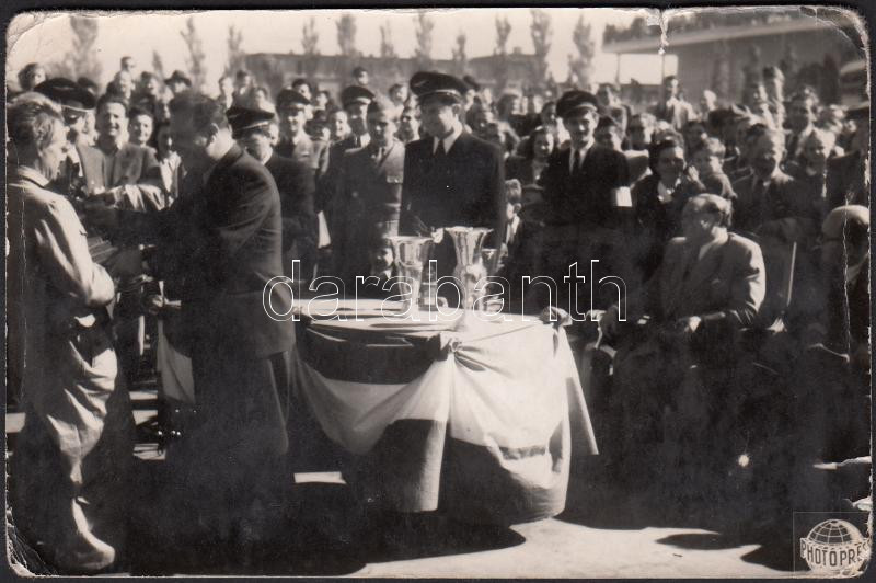 Beschreibung: cca 1940 Országos Magyar Repülő Egyesület fotó ünnepségről Falus KÁroly felvétele; pecséttel jelzett 13x8 cm
