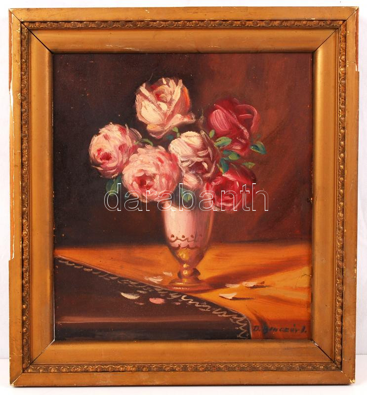 Beschreibung: D. Benczúr jelzéssel: Virágcsendélet. Olaj, karton, antik keretben, 25×22 cm
