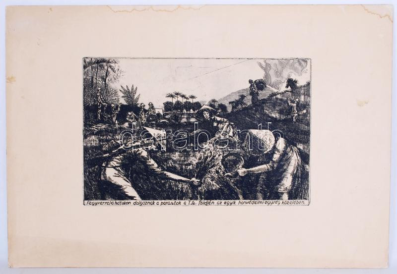 Jurida Károly (1935-2009): Fegyverrel a hátukon dolgoznak a parasztok a T.Sz. földjén az egyik honvédelmi egység közelében. Rézkarc, papír, 34,5x48,5cm