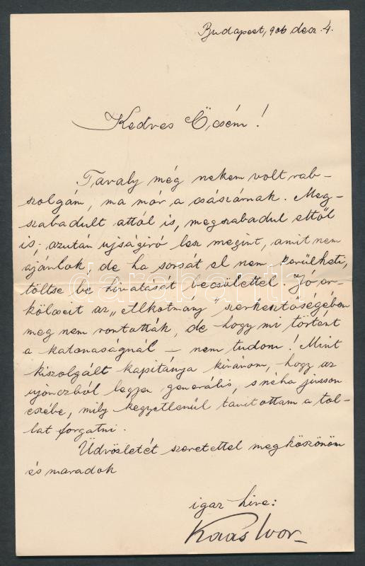 1906 Kaas Ivor publicista, politikus saját kézzel írt, bensőséges hangú levele Pogány Stemmer Kálmán publicistának