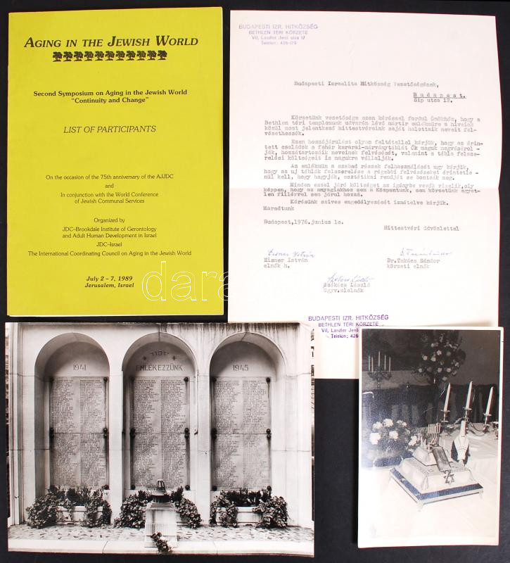 cca 1976-1989 Vegyes tétel: Aging in the Jewish World konferencia résztvevőinek listája; levél a Budapesti Izraelita Hitközség Vezetőségének; 2 db fotó (11x17 és 24x18 cm)