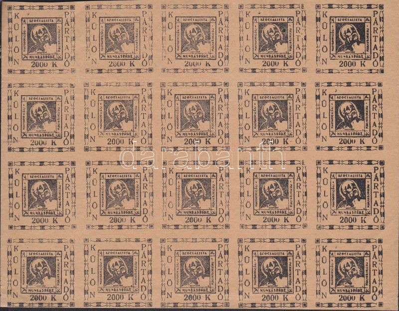 Beschreibung: 1925 Magyarországi Szocialista Munkáspárt külön pártadó-bélyeg 20 darabos ívrészlet /1925 Hungarian Socialist Workers-party party-tax stamp set of 20