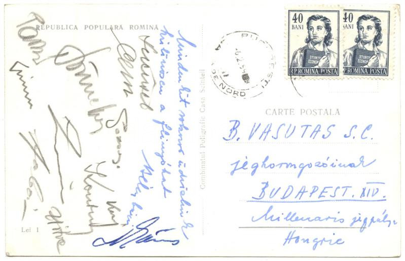 Beschreibung: 1959 Magyar jégkorong-válogatott tagjai által küldött képeslap a játékosok aláírásaival Bukarestből
