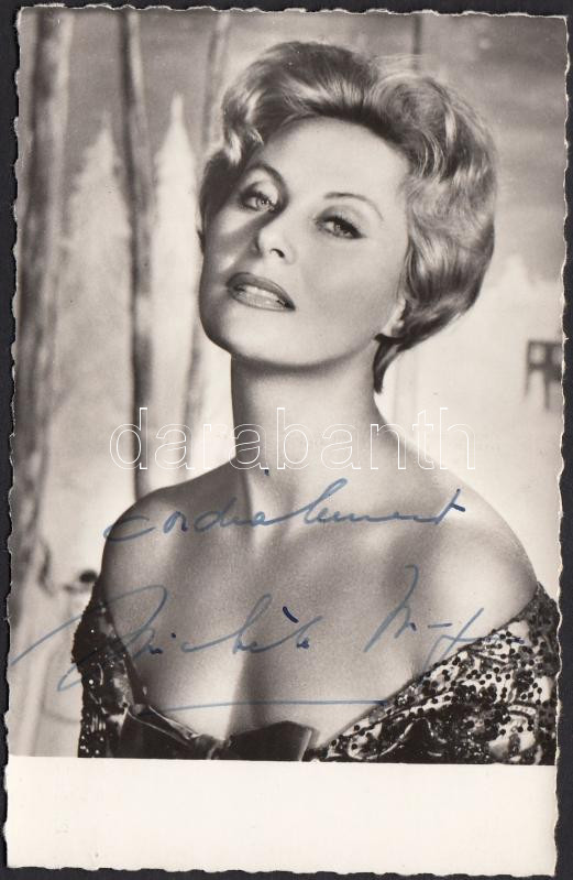 Beschreibung: Michele Morgan (1920-) francia színésznő saját kezű aláírása az őt ábrázoló fotóképeslapon /