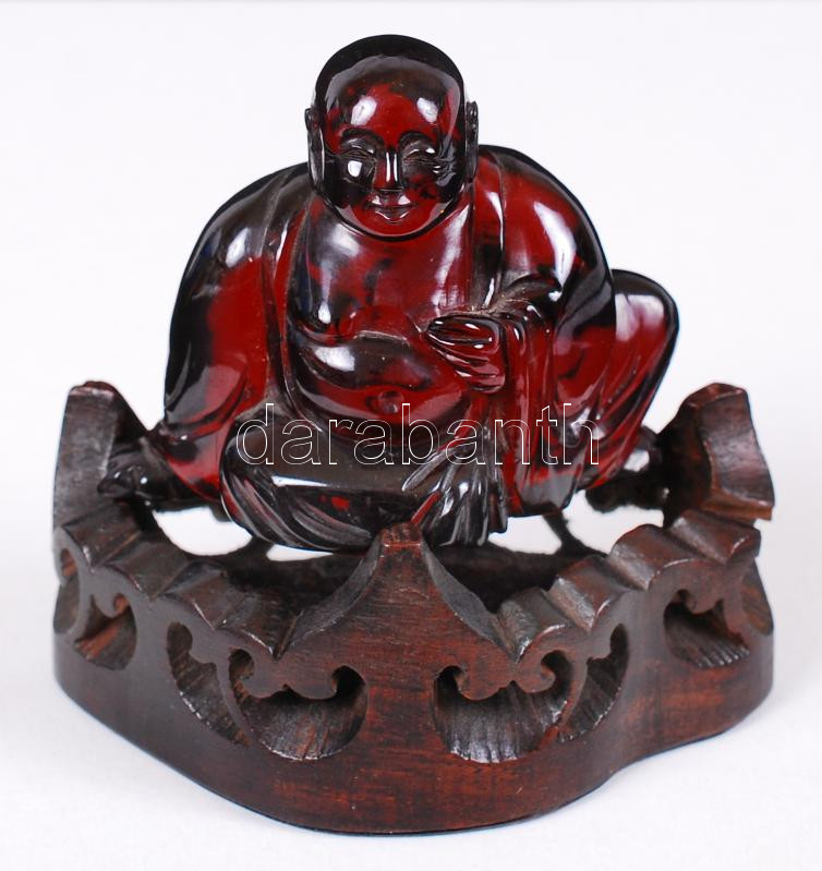 Nevető Buddha. Kézzel készített, vésett gyanta figura, kis faragott fa állványon /