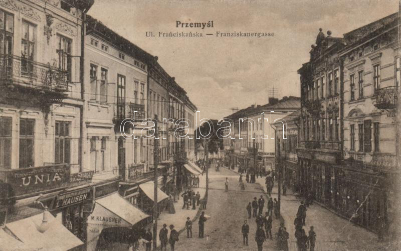 Przemysl Franciscan street, shops of L. Hausen and M. Klausner (EB) https://www.darabanth.com/de/202-Fernauktion/202.0/Ansichtskarten/Polen~600105/Przemysl-Franciscan-street-shops-of-L-Hausen-and-M-Klausner-EB~II802535