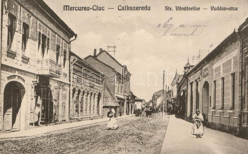 Beschreibung: Csíkszereda Vadász utca, Czáka Béla üzlete / street, shop