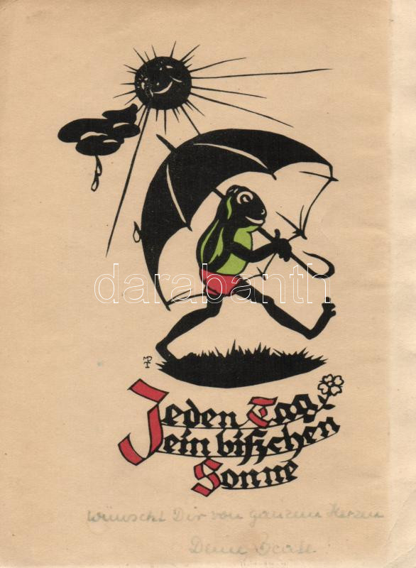 Jeden Tag ein bisschen Sonne, frog, humour (wet damage) https://www.darabanth.com/de/202-Fernauktion/202.0/Ansichtskarten/Tierwelt~600020/Jeden-Tag-ein-bisschen-Sonne-frog-humour-wet-damage~II736986