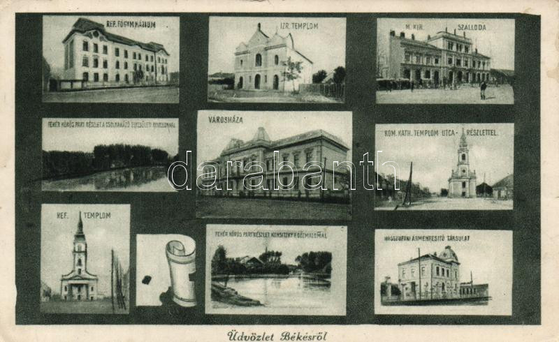 Békés zsinagóga, Hosszúfoki Ármentesítő Társulat háza https://www.darabanth.com/de/202-Fernauktion/202.0/Ansichtskarten/Ungarn~400005/Bekes-zsinagoga-Hosszufoki-Armentesito-Tarsulat-haza~II800882