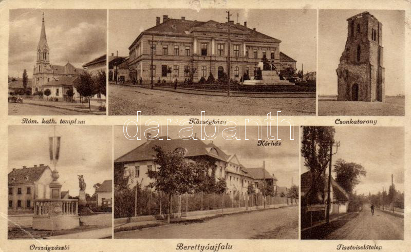 Beschreibung: Berettyóújfalu, Római katolikus templom, községháza, Csonkatorony, országzászló, kórház, Tisztviselőtelep (EB)
