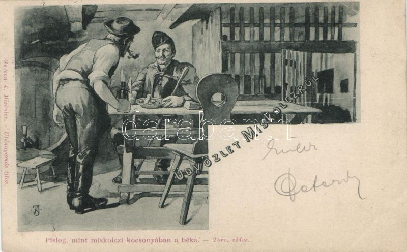 Miskolc 'Pislog, mint a miskolci kocsonyában a béka'; Gedeon... https://www.darabanth.com/de/202-Fernauktion/202.0/Ansichtskarten/Ungarn~400005/Miskolc-Pislog-mint-a-miskolci-kocsonyaban-a-beka-Gedeon-A-kiadasa~II799851