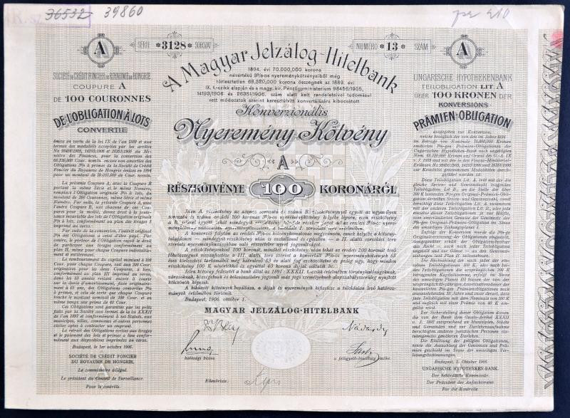 Budapest 1906. "A Magyar Jelzálog-Hitelbank" Nyeremény-Kötvé... https://www.darabanth.com/de/202-Fernauktion/202.0/Numismatik/Aktien-und-Tickets~600006/Budapest-1906-A-Magyar-Jelzalog-Hitelbank-Nyeremeny-Kotveny-A-es-B-reszkotvenye-100K-~II805607