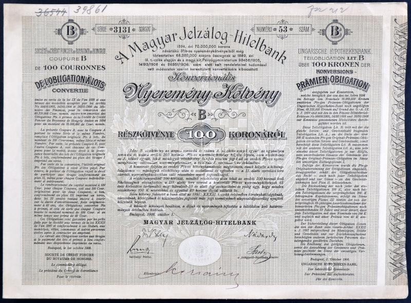 Beschreibung: Budapest 1906. "A Magyar Jelzálog-Hitelbank" Nyeremény-Kötvény "A" és "B" részkötvénye 100K-ról, 3 nyelven T:II