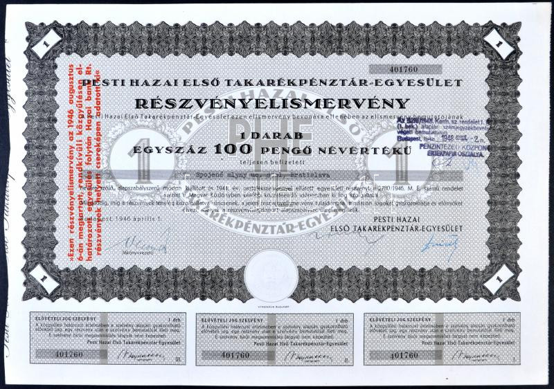 Budapest 1946. "Pesti Hazai Első Takarékpénztár-Egyesület" R... https://www.darabanth.com/de/202-Fernauktion/202.0/Numismatik/Aktien-und-Tickets~600006/Budapest-1946-Pesti-Hazai-Elso-Takarekpenztar-Egyesulet-Reszvenyelismerveny-100P-rol-TI~II804197
