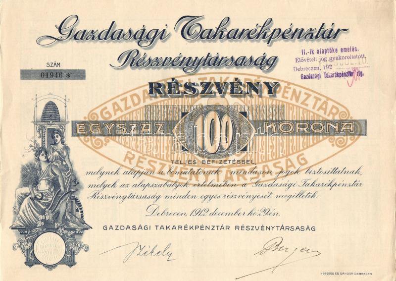 Debrecen 1912. "Gazdasági Takarékpénztár Részvénytársaság" r... https://www.darabanth.com/de/202-Fernauktion/202.0/Numismatik/Aktien-und-Tickets~600006/Debrecen-1912-Gazdasagi-Takarekpenztar-Reszvenytarsasag-reszvenye-100K-rol-szelvenyek~II801342