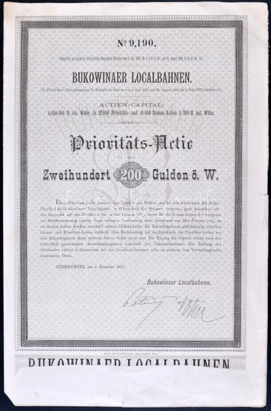 Ukrajna / Csernyivci 1887. Bukovinai helyi vasút részvénye 200G-ről német nyelven szelvényekkel T:II