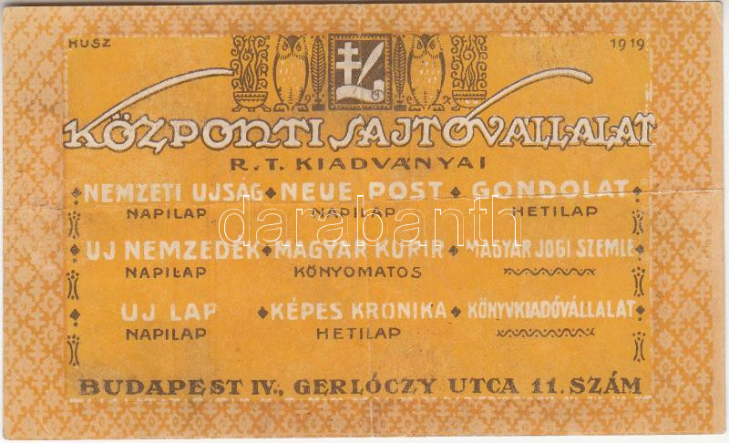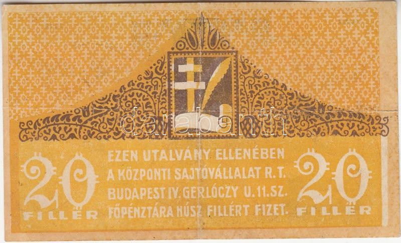 Budapest 1919. 20f "Központi Sajtóvállalat R.T." T:III https://www.darabanth.com/de/202-Fernauktion/202.0/Numismatik/Notgelden~600007/Budapest-1919-20f-Kozponti-Sajtovallalat-RT-TIII~II800782
