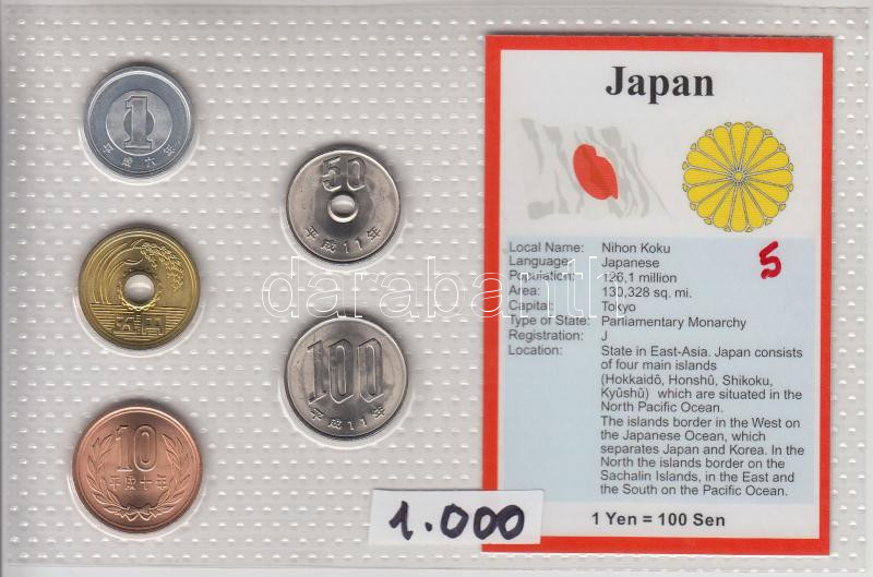 Japan 1989. 1 Yen ... https://www.darabanth.com/de/202-Fernauktion/202.0/Numismatik/Weltweit-Munzen~600013/Japan-1989-1Y--100Y-5klf-darab-bemutato-szett-T1-3Cbr3EJapan-1989-1-Yen--100-Yen-5-different-~II802704