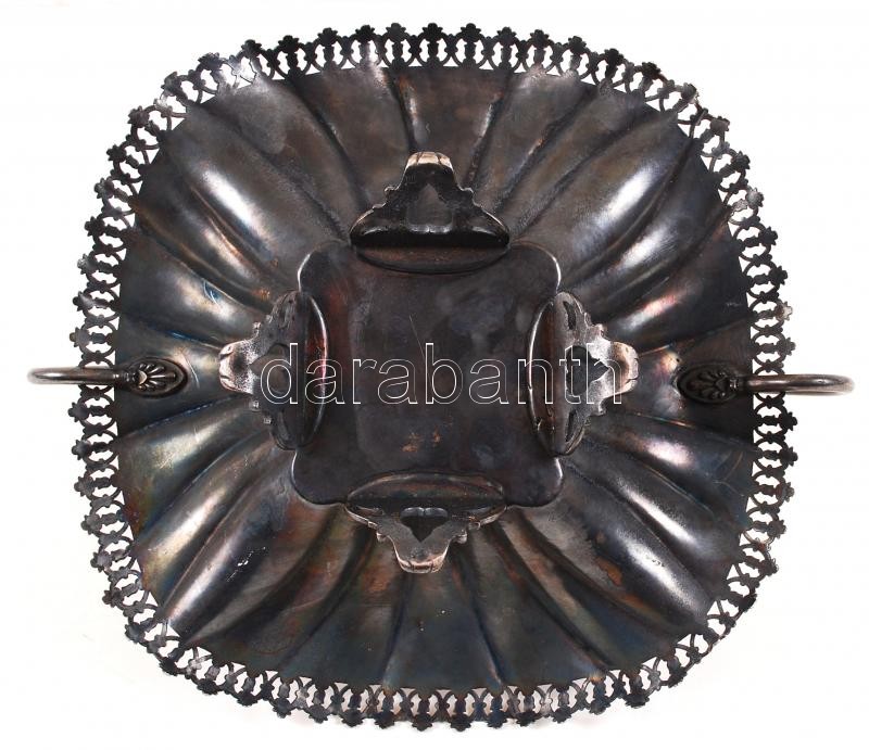 Beschreibung: Gazdagon díszített füles kínálókosár, jelzés nélkül, fém, jó állapotban, 28×24 cm, m:18 cm