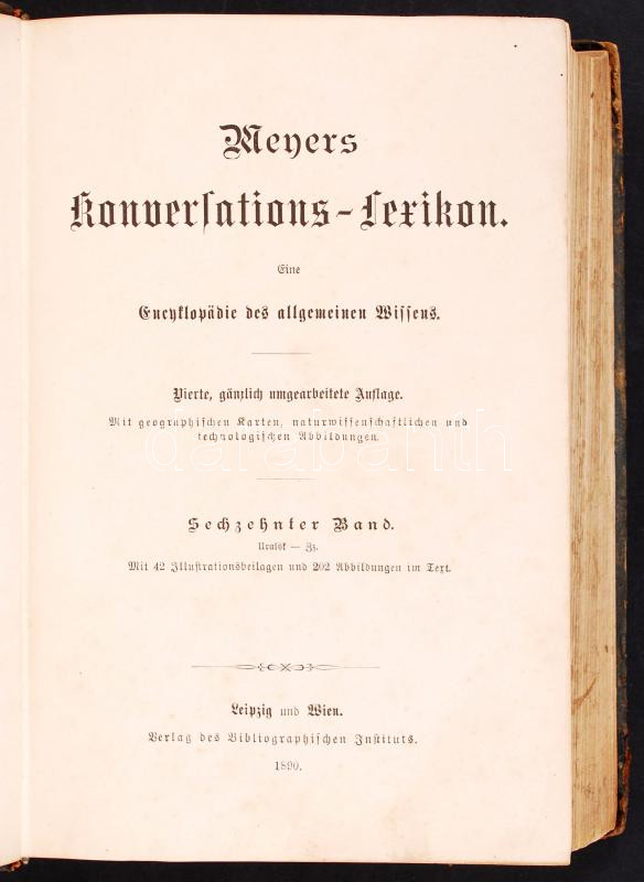 Meyers Konversations-Lexikon. Eine Enciklopädie des allgemeinen Wissens. Vierte, gänzlich umgearbeitete Auflage. Mit geographischen Karten, naturwissenschaftlichen und techmologischen Abbildungen. Sechzehnter Band. Mit 42 Illustrationsbeilagen und 202 Abbildungen im Text. Leipzig/Wien, 1890, Verlag des Bibliographischen Instituts. Kiadói félbőr kötésben, bordázott, aranyozott gerinccel, jó állapotban.