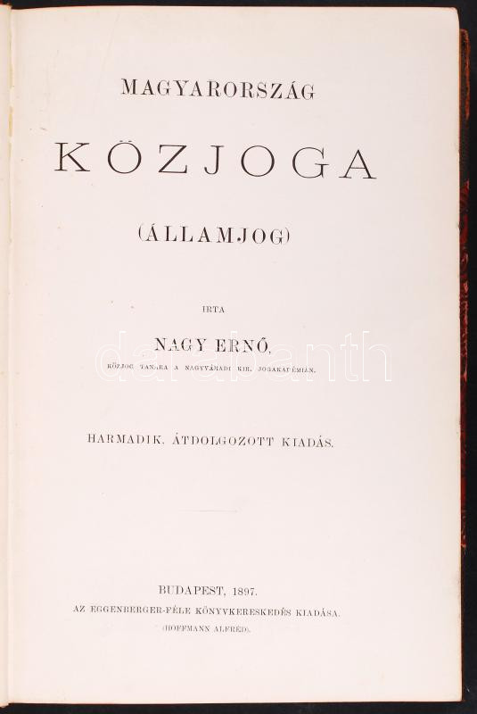 Nagy Ernő: Magyarország közjoga (államjog). 3. átdolgozott kiadás. Bp.... https://www.darabanth.com/de/203-Fernauktion/203.0/Andere-Sammelgebiete/Bucher-Justiz~200040/Nagy-Erno-Magyarorszag-kozjoga-allamjog-3-atdolgozott-kiadas-Bp-1897-Eggenberger-Kor~II807954